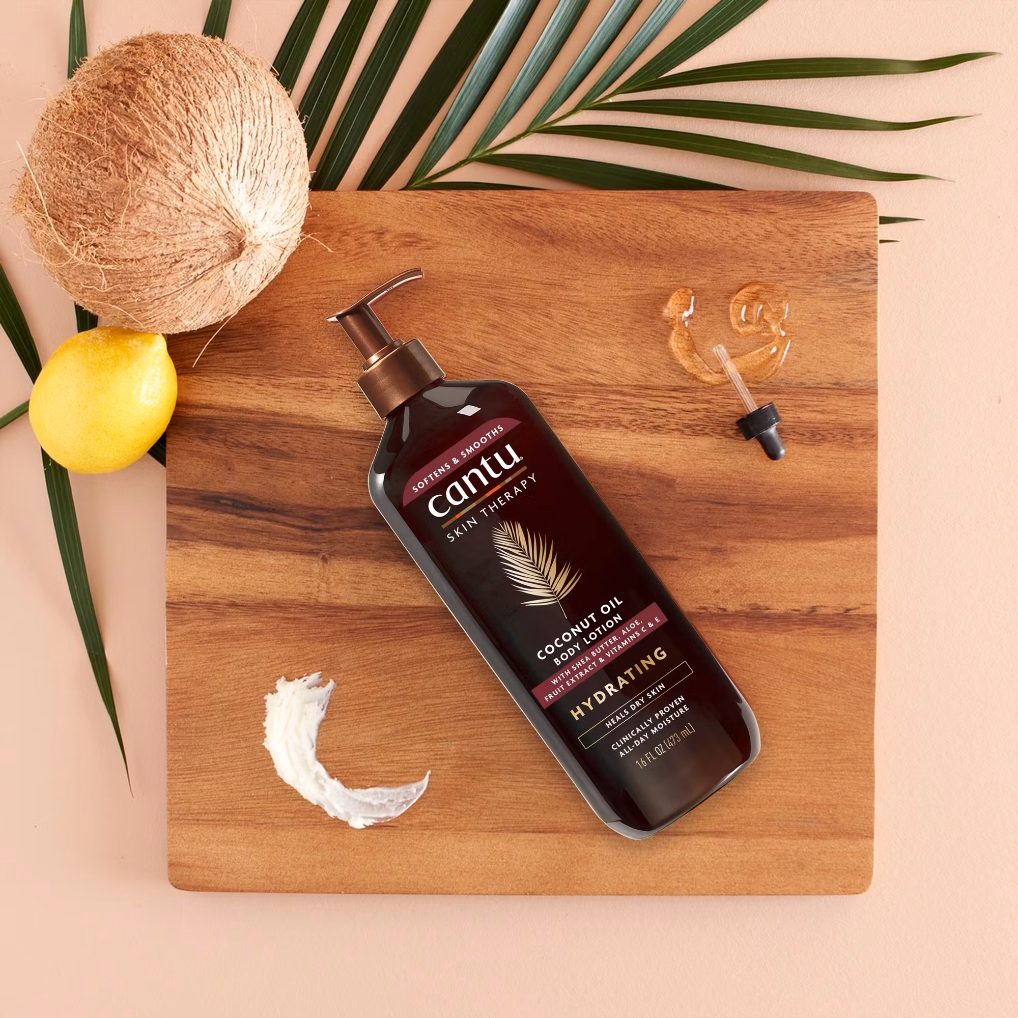 Cantu Skin Therapy Hydrating Coconut Oil Body Lotion är formulerad med naturligt återfuktande kokosolja och en ultrafuktande blandning av sheasmör, kakaosmör, mangosmör, jojobaolja, arganolja, aloe och vitamin E. Denna snabbabsorberande formula håller huden återfuktad och mjuk vid beröring.